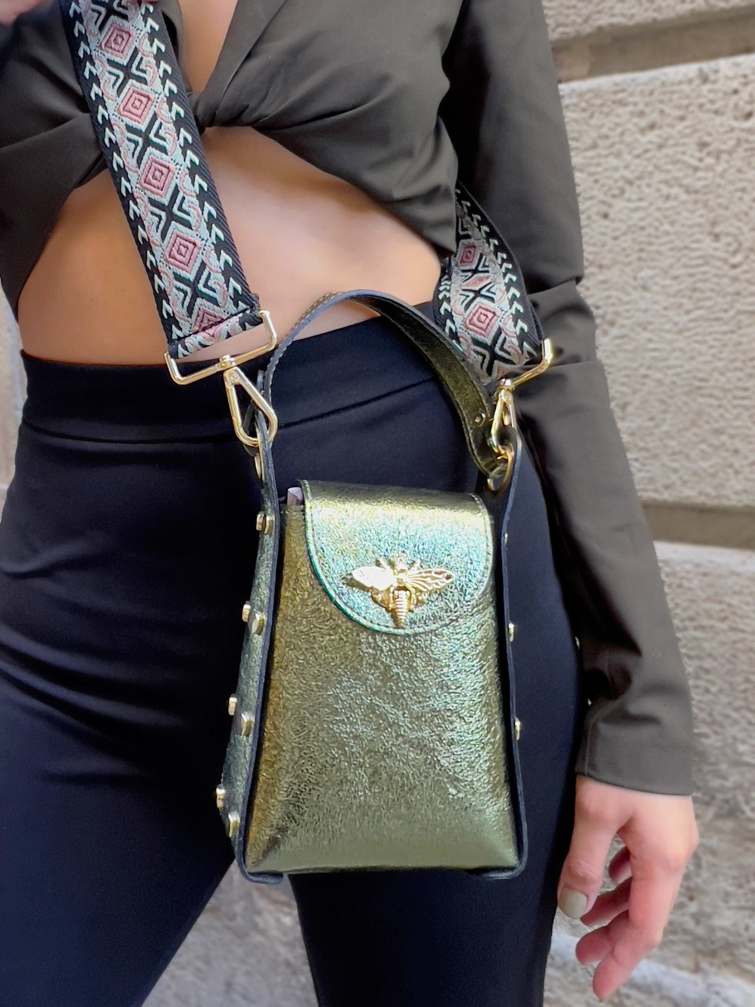 Bee Stylish with our Bee Bag Collection! This double handle bag has a removable strap that allows you to carry it comfortably on your shoulder or as a strap-on bag. This bag is perfect for every day use, to always have your belongings at hand as it has perfect room for your phone,wallet and keys. It's durable and easy to clean. Genuine leather and handmade in Italy.